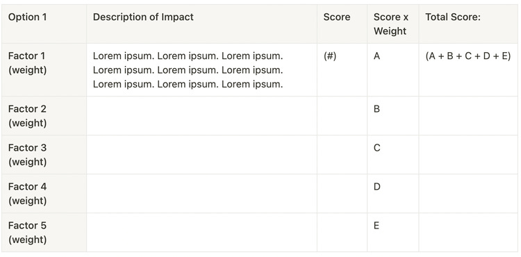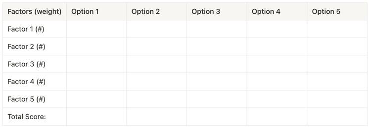 Whichever option you choose, it’s time to fill out your decision matrix with your top options and factors. Consider how each option addresses the factors you selected and give them a score from 1–5 (1 = doesn’t meet this criterion, 5 = perfect fulfillment of criterion).